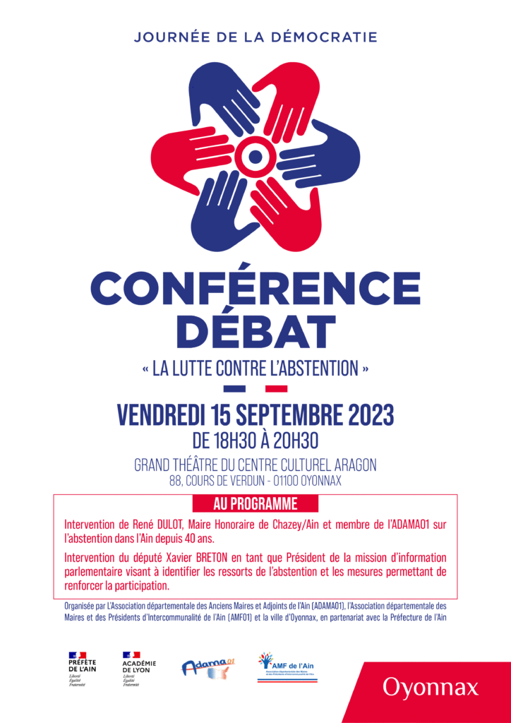 La Ville d’Oyonnax a décidé de prendre pleinement part à cet évènement en vous proposant de participer à une conférence-débat sur la « lutte contre l’abstention », qui se tiendra vendredi 15 septembre 2023 dès 18h30 au Grand théâtre du Centre Culturel Aragon.